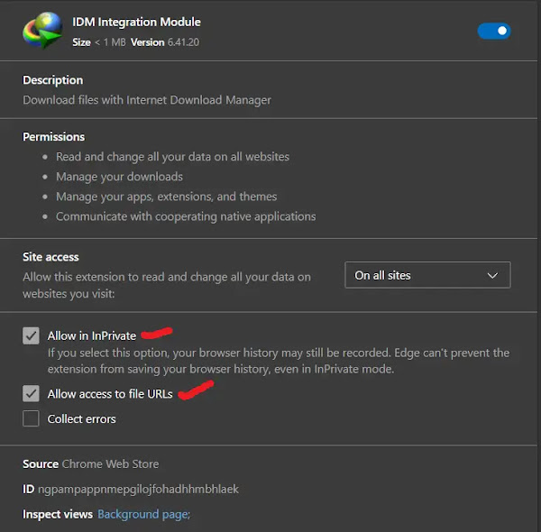 Enable “Allow in InPrivate” If you want to use IDM integration in Private browsing mode as well and “Allow access to file